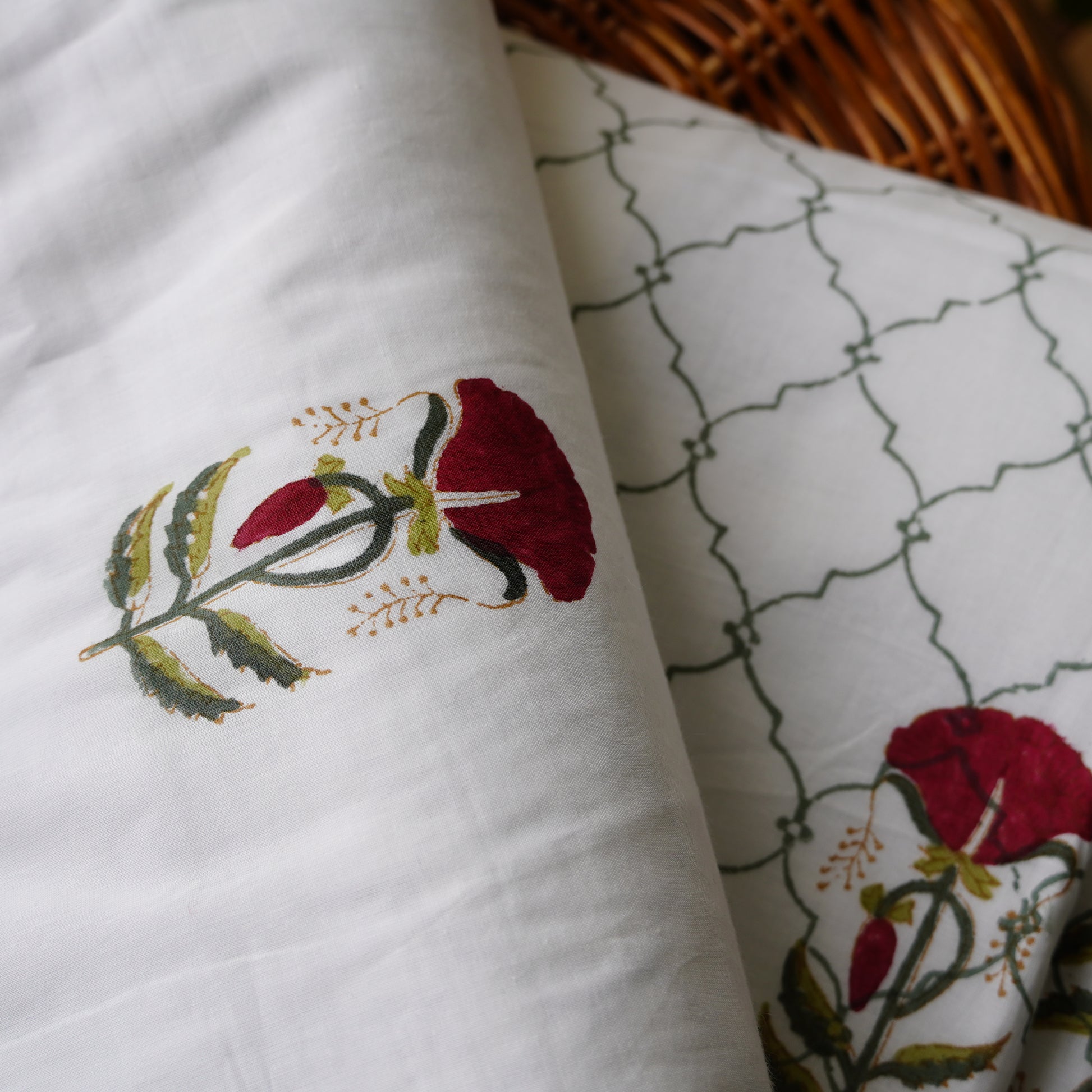 Handblock printing, known for its imperfections, offers a distinct beauty that can only be achieved through this traditional printing method. As a result, the product may display variations in color, irregular shapes, varied sizes, and little smudges adding to its charm and authenticity.