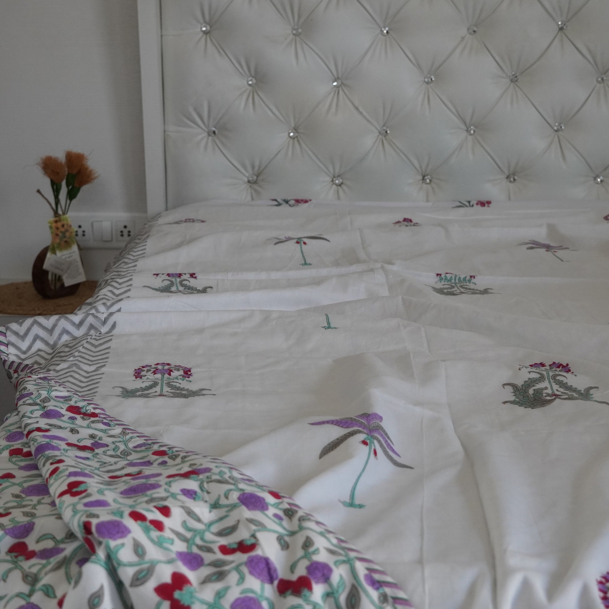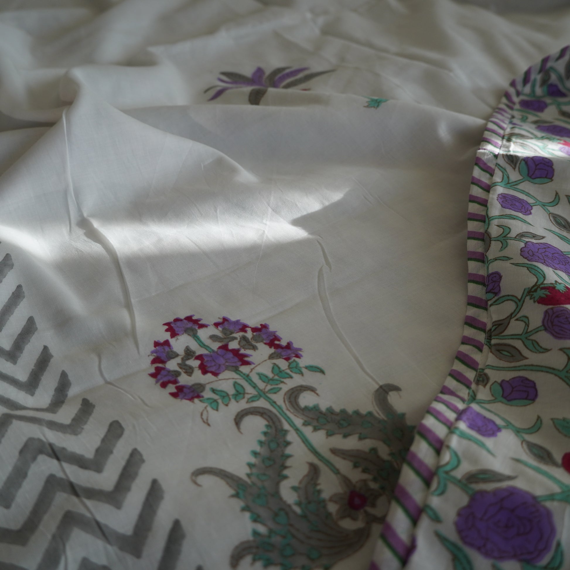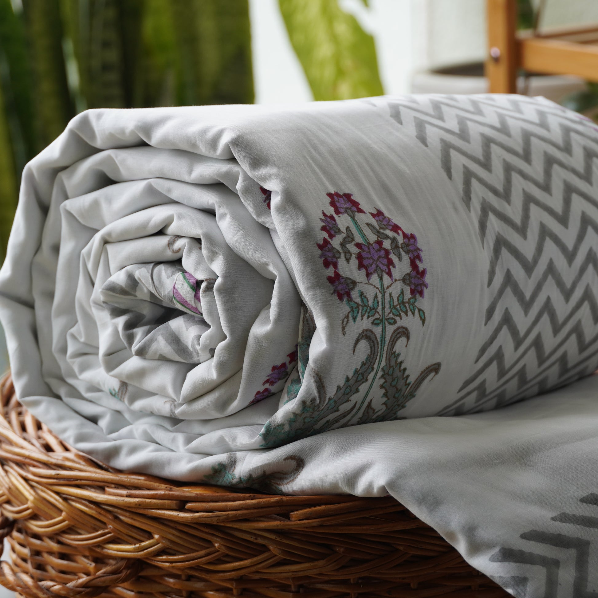 Experience the unmatched comfort of our handblocked AC dohar. Made with 100% pure mul cotton with a flannel sheet in between, this reversible dohar is soft and breathable. Perfect for all seasons, it keeps you warm in winter and cool in summer.