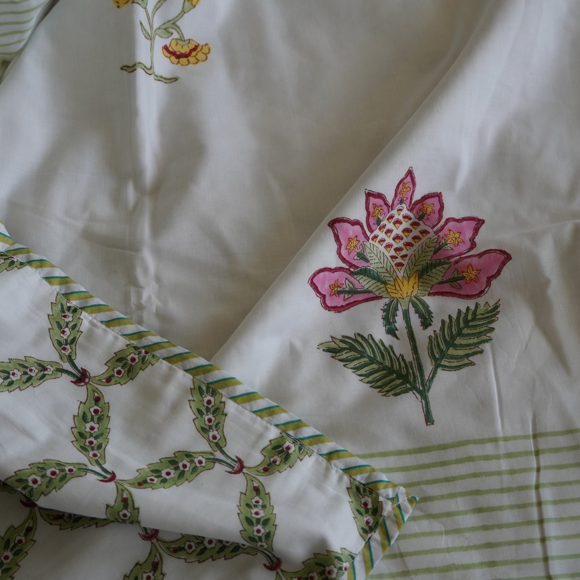 Handblock printing, known for its imperfections, offers a distinct beauty that can only be achieved through this traditional printing method. As a result, the product may display variations in color, irregular shapes, varied sizes, and little smudges adding to its charm and authenticity.